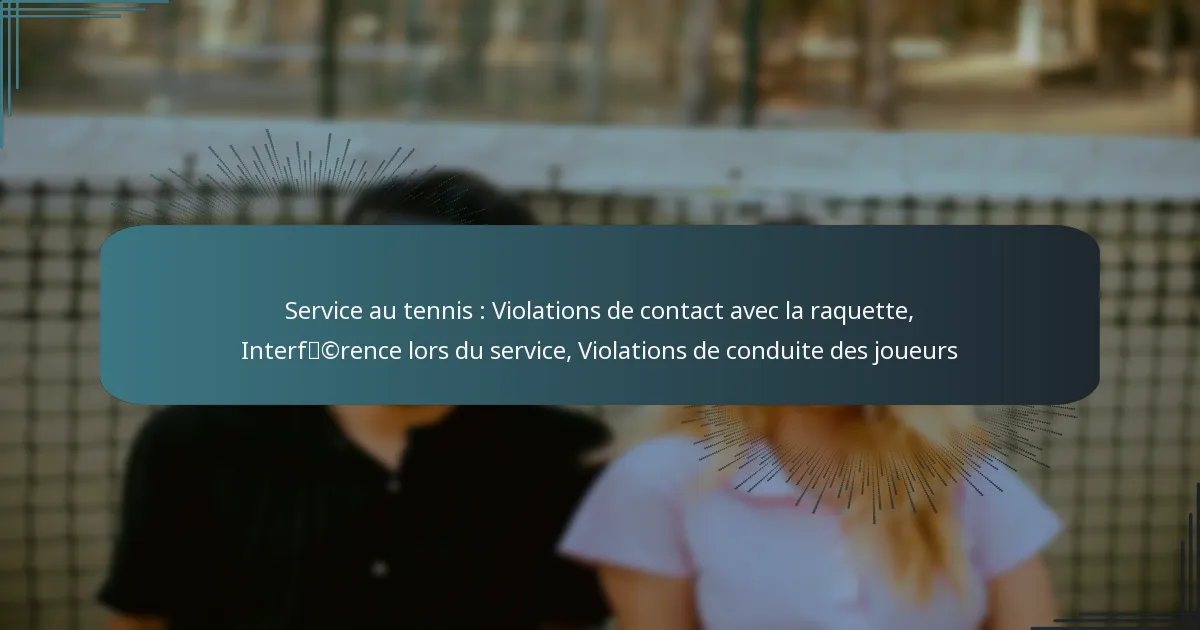 Le service au tennis implique une stricte adhésion aux règles concernant le contact avec la raquette, l’interférence lors du service et la conduite des joueurs. Les violations liées au contact avec la raquette peuvent entraîner des pénalités, tandis que l’interférence lors du service perturbe la capacité du serveur à performer efficacement. De plus, les violations de conduite des joueurs peuvent compromettre l’intégrité du match, rendant essentiel pour les joueurs de comprendre ces réglementations afin de maintenir un jeu équitable.